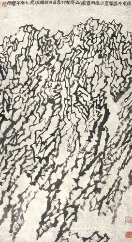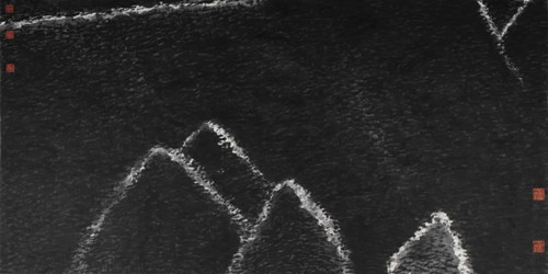 《2023·11號(hào)》是姜寶林對(duì)貴州萬峰林的描繪。這幅作品展現(xiàn)了積墨的平面化特點(diǎn),積墨除了表現(xiàn)對(duì)象外,還是一種提煉過的形式美元素。用筆的方向、粗細(xì)、濃淡基本一致,積墨形成的黑色塊面,把白色的外輪廓形線擠出,如黑夜中的閃電,靜穆中給人以奇異的視覺感受。白色輪廓線一方面是山的外形線,另一方面起到分割畫面的作用,很有形式感。