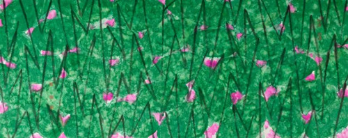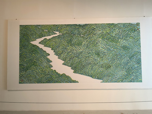 《2023·12號(hào)》則以抽象繪畫的形式,表現(xiàn)了西湖陽(yáng)光下盛開的大片荷花,再現(xiàn)了楊萬里“接天碧葉無窮,映日荷花別樣紅”的詩(shī)意。該作品第一稿是2021年為紀(jì)念建黨一百周年創(chuàng)作的,這是第三稿,構(gòu)圖更加鋪開。沒有強(qiáng)調(diào)單片的荷葉,所有荷葉連接成一個(gè)整體的綠色塊面,用潑彩的手法,非常生動(dòng)。荷桿用筆為中鋒的篆書筆意,在形式上歸納提煉成呈三角的線構(gòu)成,荷花用沒骨法,在與葉和桿的疊加交錯(cuò)中露出一點(diǎn)空白,起到透氣的作用。滿構(gòu)圖,鋪滿畫面,與傳統(tǒng)文人畫的荷花意境迥然不同,表現(xiàn)出生機(jī)勃勃的夏日荷花印象。