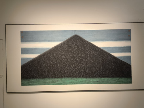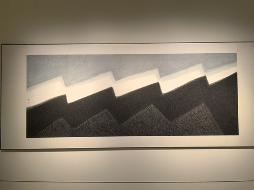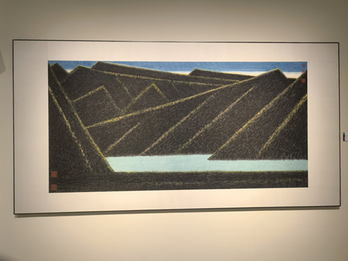 漫步畫前,有三件作品尤為引人注目。《賀蘭山一截》的創(chuàng)作靈感來源于1980年冬天的一次采風(fēng),當(dāng)時(shí)姜寶林還在中央美術(shù)學(xué)院讀研究生。他第一次去大西北,看到陽(yáng)光下的冬日賀蘭山,在藍(lán)天的映照下,對(duì)比非常強(qiáng)烈。山上幾乎沒有植被,只有巖石,山石紋理結(jié)構(gòu)呈現(xiàn)抽象美。姜寶林以單純的方筆筆線,精準(zhǔn)捕捉并表現(xiàn)了賀蘭山的山體特征,采用局部放大的構(gòu)圖形式,展現(xiàn)了其深厚的藝術(shù)造詣與獨(dú)特的視角。1992年,該作品獲“第26屆蒙特卡洛現(xiàn)代繪畫世界大獎(jiǎng)賽”大公政府獎(jiǎng)。
